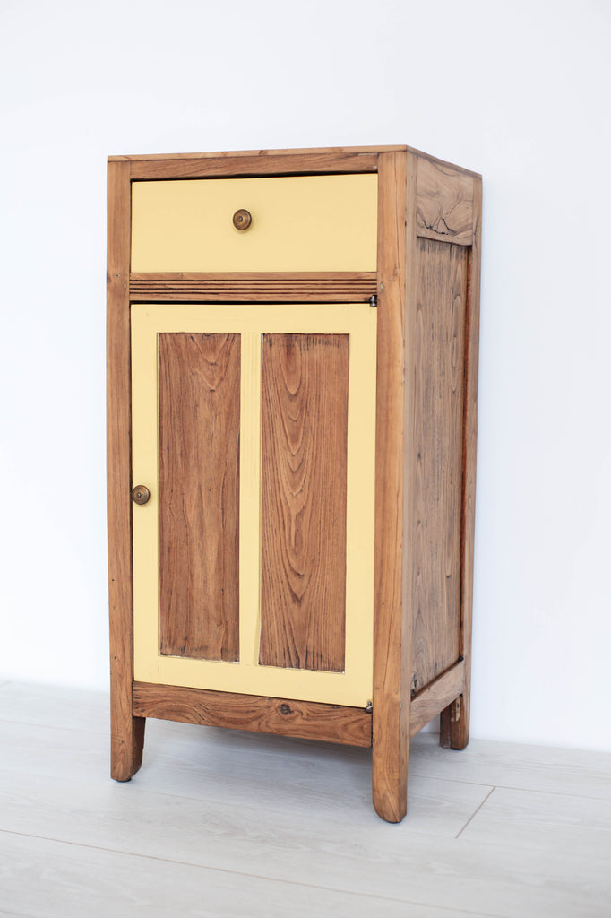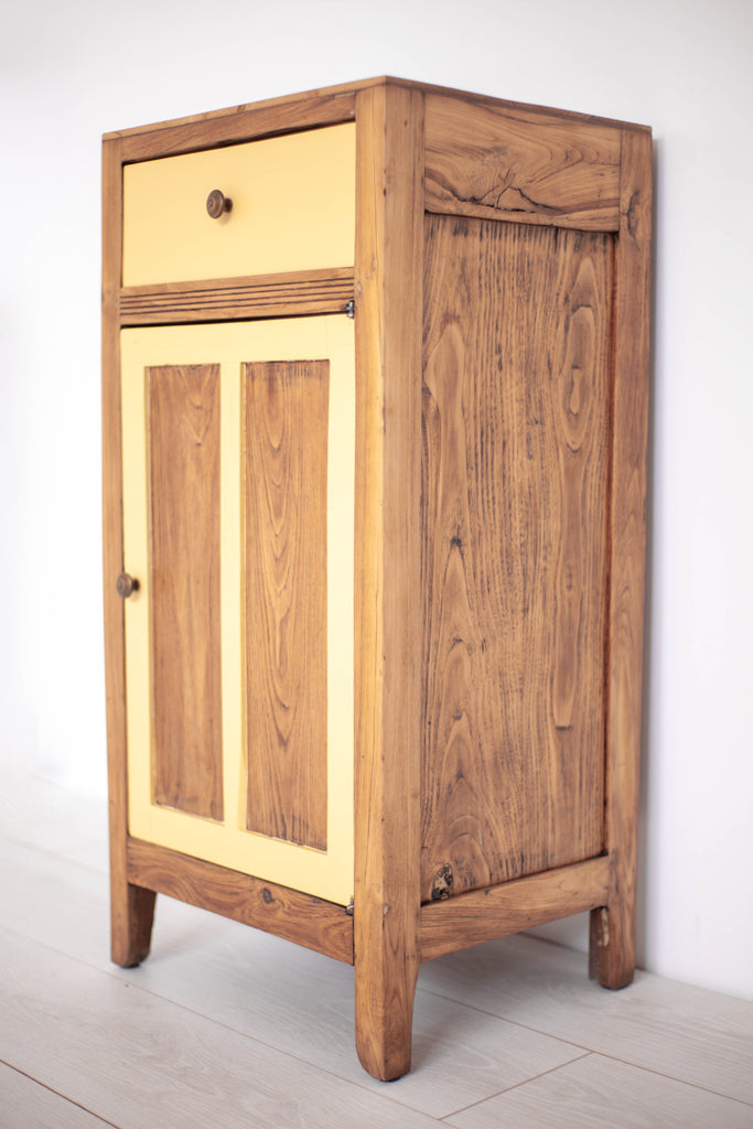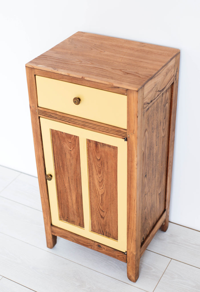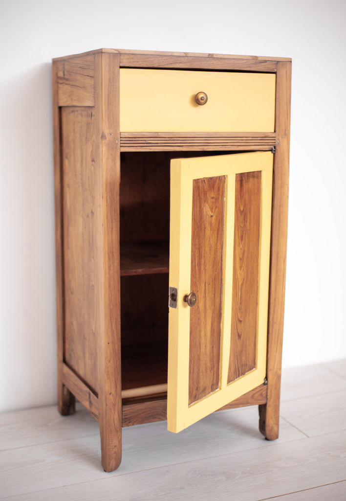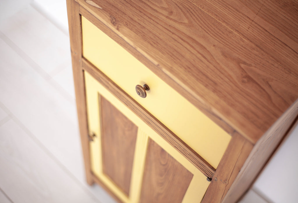 Questo comodino in legno di castagno unisce linee pulite e stile vintage, con struttura in essenza naturale e panelli frontali verniciati in giallo caldo.